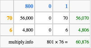 That's all there is to it! As you can see from the box above, the answer to 801 times 76 using the box method is 60,876.