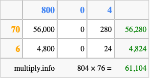 That's all there is to it! As you can see from the box above, the answer to 804 times 76 using the box method is 61,104.
