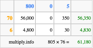 Finally, we add up all the sums we found in step 3 to get our final answer to 805 times 76.