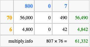 Finally, we add up all the sums we found in step 3 to get our final answer to 807 times 76.