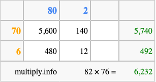 Below is an illustration showing you how to calculate 82 times 76 using the box method, using the instructions above.
