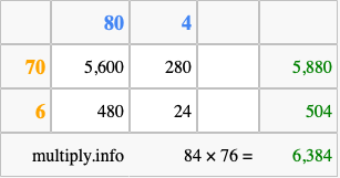 Finally, we add up all the sums we found in step 3 to get our final answer to 84 times 76.
