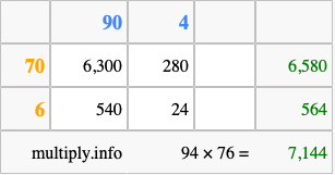 Below is an illustration showing you how to calculate 94 times 76 using the box method, using the instructions above.
