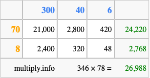 Finally, we add up all the sums we found in step 3 to get our final answer to 346 times 78.
