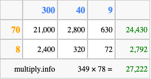 Finally, we add up all the sums we found in step 3 to get our final answer to 349 times 78.