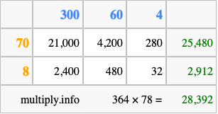 Finally, we add up all the sums we found in step 3 to get our final answer to 364 times 78.