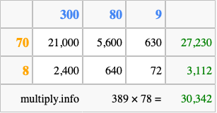 That's all there is to it! As you can see from the box above, the answer to 389 times 78 using the box method is 30,342.