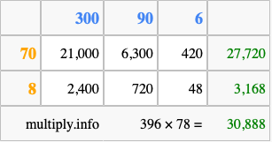Finally, we add up all the sums we found in step 3 to get our final answer to 396 times 78.