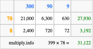 Finally, we add up all the sums we found in step 3 to get our final answer to 399 times 78.