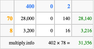 That's all there is to it! As you can see from the box above, the answer to 402 times 78 using the box method is 31,356.