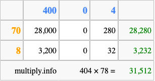 That's all there is to it! As you can see from the box above, the answer to 404 times 78 using the box method is 31,512.