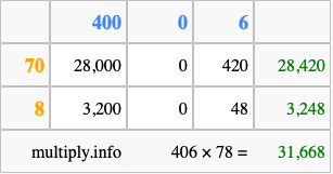That's all there is to it! As you can see from the box above, the answer to 406 times 78 using the box method is 31,668.