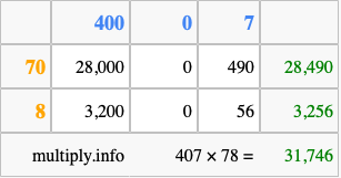 That's all there is to it! As you can see from the box above, the answer to 407 times 78 using the box method is 31,746.