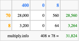 That's all there is to it! As you can see from the box above, the answer to 408 times 78 using the box method is 31,824.