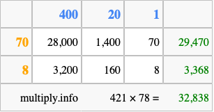 That's all there is to it! As you can see from the box above, the answer to 421 times 78 using the box method is 32,838.