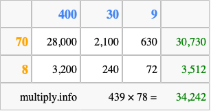 That's all there is to it! As you can see from the box above, the answer to 439 times 78 using the box method is 34,242.