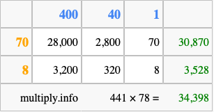 That's all there is to it! As you can see from the box above, the answer to 441 times 78 using the box method is 34,398.
