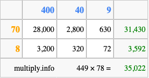 That's all there is to it! As you can see from the box above, the answer to 449 times 78 using the box method is 35,022.