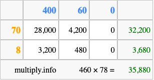 That's all there is to it! As you can see from the box above, the answer to 460 times 78 using the box method is 35,880.