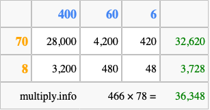 Finally, we add up all the sums we found in step 3 to get our final answer to 466 times 78.