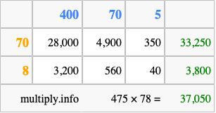 Finally, we add up all the sums we found in step 3 to get our final answer to 475 times 78.