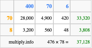 Finally, we add up all the sums we found in step 3 to get our final answer to 476 times 78.