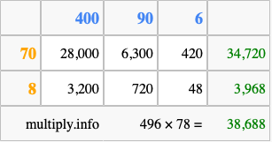 That's all there is to it! As you can see from the box above, the answer to 496 times 78 using the box method is 38,688.