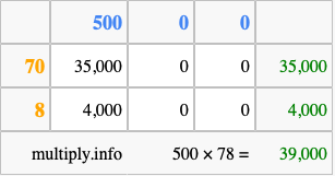 Below is an illustration showing you how to calculate 500 times 78 using the box method, using the instructions above.