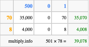 Below is an illustration showing you how to calculate 501 times 78 using the box method, using the instructions above.