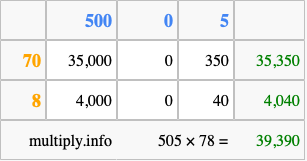That's all there is to it! As you can see from the box above, the answer to 505 times 78 using the box method is 39,390.