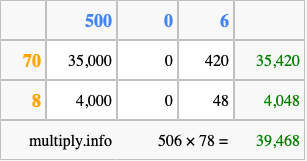 That's all there is to it! As you can see from the box above, the answer to 506 times 78 using the box method is 39,468.