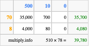 Below is an illustration showing you how to calculate 510 times 78 using the box method, using the instructions above.