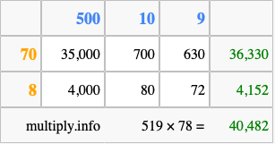 That's all there is to it! As you can see from the box above, the answer to 519 times 78 using the box method is 40,482.