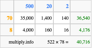 That's all there is to it! As you can see from the box above, the answer to 522 times 78 using the box method is 40,716.