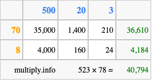 That's all there is to it! As you can see from the box above, the answer to 523 times 78 using the box method is 40,794.