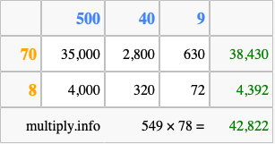 That's all there is to it! As you can see from the box above, the answer to 549 times 78 using the box method is 42,822.