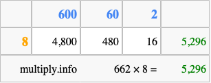 That's all there is to it! As you can see from the box above, the answer to 662 times 8 using the box method is 5,296.