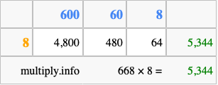 That's all there is to it! As you can see from the box above, the answer to 668 times 8 using the box method is 5,344.
