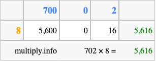 That's all there is to it! As you can see from the box above, the answer to 702 times 8 using the box method is 5,616.