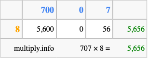 That's all there is to it! As you can see from the box above, the answer to 707 times 8 using the box method is 5,656.