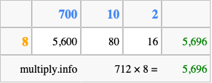 That's all there is to it! As you can see from the box above, the answer to 712 times 8 using the box method is 5,696.