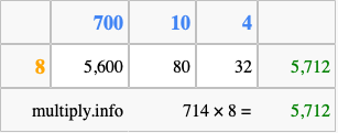 That's all there is to it! As you can see from the box above, the answer to 714 times 8 using the box method is 5,712.