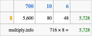That's all there is to it! As you can see from the box above, the answer to 716 times 8 using the box method is 5,728.