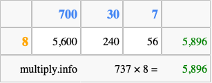 That's all there is to it! As you can see from the box above, the answer to 737 times 8 using the box method is 5,896.