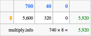 That's all there is to it! As you can see from the box above, the answer to 740 times 8 using the box method is 5,920.