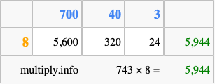 That's all there is to it! As you can see from the box above, the answer to 743 times 8 using the box method is 5,944.