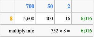 Below is an illustration showing you how to calculate 752 times 8 using the box method, using the instructions above.