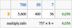 Below is an illustration showing you how to calculate 757 times 8 using the box method, using the instructions above.