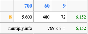 Below is an illustration showing you how to calculate 769 times 8 using the box method, using the instructions above.