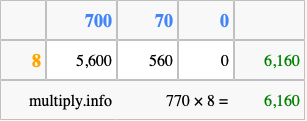 That's all there is to it! As you can see from the box above, the answer to 770 times 8 using the box method is 6,160.